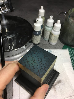 Première étape, texturer la surface lisse du socle. J'utilise 3 couleurs : Bleu Marine Foncé, Gris Pierre, Vert Citron. Je mélange toutes les couleurs en gardant les parties foncées sur l'extérieur du socle. Le Vert Citron est là pour faire un rappel de la figurine.